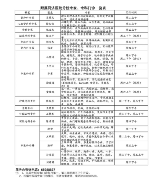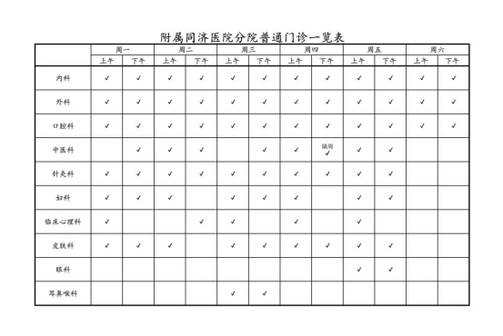 同济大学门诊部开设:内科、外科、全科、中医科、妇科、放射科、检验科、心电图室;
