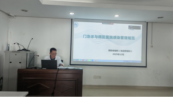 2025年12月9日中午,校医院于四楼会议室面向全院医护、医技及相关岗位工作人员,举办门急诊与病区医院感染管理规范专题培训。嘉定卫生所医护人员亦通过腾讯会议平台线上同步参与。本次培训由预防保健科(院感管理科)主任刘国强担任主讲,旨在全面强化全体人员的感染控制意识,提升感染防控实操能力,严守医疗安全底线,进一步巩固院校医疗卫生服务体系中的传染病防控机制。