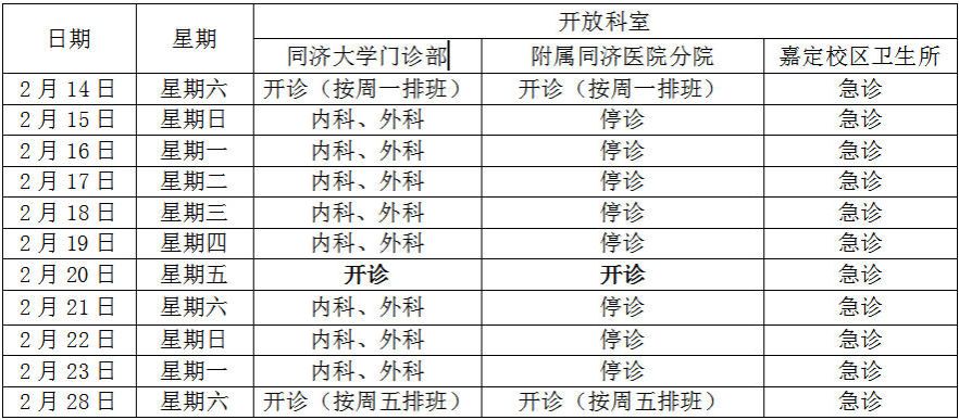 1. 2月15日~2月23日为国定假日,共9天,期间2月20日(星期五)同济大学门诊部门急诊正常开诊,附属同济医院分院门诊正常开诊;春节假日期间同济大学门诊部开设内科急诊(24小时),外科急诊(8:00-17:00);嘉定校区卫生所开设急诊(24小时)。