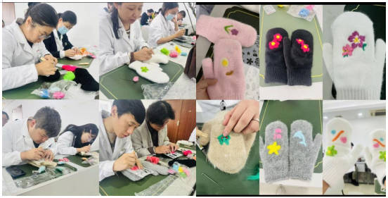 活动特别邀请了专业老师进行现场指导,老师首先向大家详细讲解了羊毛毡工艺的历史渊源、基本特性,重点演示了针毡和湿毡两种基础制作技法的操作要点、工具使用规范以及常见问题的解决方法。从羊毛的选取、铺展,到针毡的戳制力度与角度,再到手套形状的塑形与修饰,老师讲解得细致入微,职工们听得专心致志,不时点头记录,现场学习氛围十分浓厚。到了实操环节,会议室瞬间变成了“创意工坊”!大家拿起羊毛就开始“大展身手”,有人小心翼翼地铺着羊毛,生怕戳错分毫;有人则大胆尝试,直接搭配起撞色来;遇到卡壳的地方,就扭头喊一句“老师,这个怎么弄呀”,或者跟旁边的同事凑在一起商量。会议室里,往日里的呼叫铃声悄然隐匿,取而代之的是“哒哒”的戳毡声与此起彼伏的笑声。原本平平无奇的羊毛,在大家的巧手下慢慢变样,一个个带着个人风格的手套雏形渐渐冒了出来——有的绣了小花纹,有的做了翻边设计,每一件都独一无二。