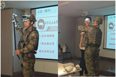 在基础操作环节,教官围绕战场常见伤情的处置,开展了系统性的核心技能教学。针对“致命性出血”这一战场高频致命伤情,教官详细讲解了判断标准,现场演示了旋压式止血带的正确使用方法、填塞止血法的操作要点,强调“快速识别、精准止血”是挽救生命的第一道防线。